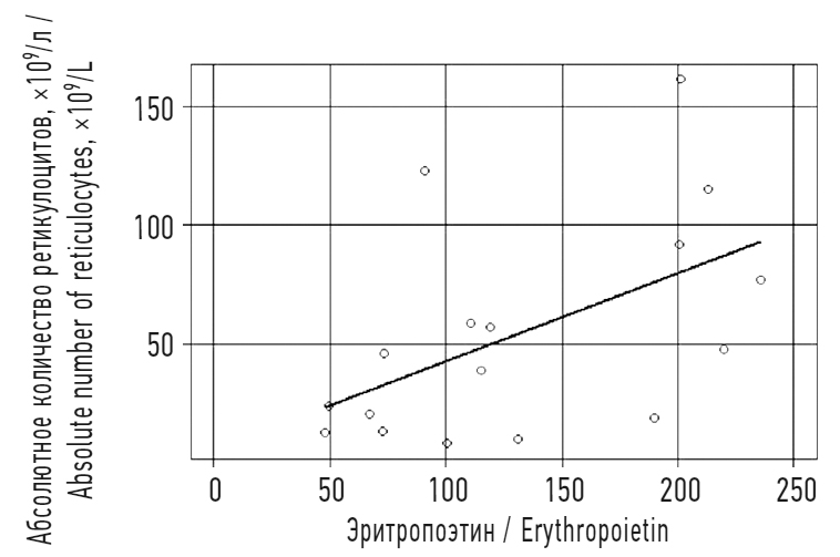 Рис. 1. Корреляция абсолютного количества ретикулоцитов периферической крови и содержания эритропоэтина в сыворотке крови недоношенных детей на момент манифестации анемии недоношенных