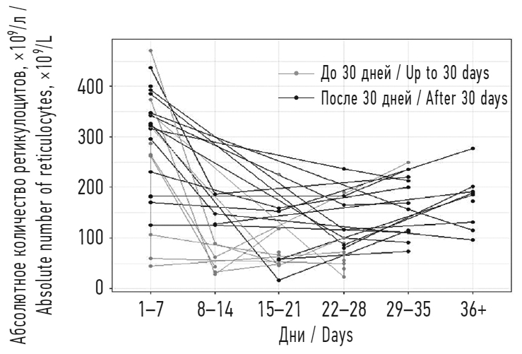 Динамику количества ретикулоцитов у недоношенных детей исследовали до манифестации заболевания, так как именно у гипорегенераторного характера РАН было решающее значение в патогенезе заболевания. Анализ динамики абсолютных и относительных показателей количества ретикулоцитов недоношенных новорожденных в первые 30 сут жизни показал, что минимальные значения количества ретикулоцитов, определяющие срок манифестации РАН, недоношенные новорожденные имели на 8–14-й дни жизни (рис. 2 и 3).