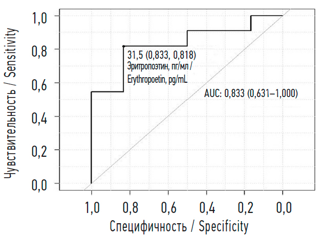 Эритропоэтин, пг/мл / Erythropoietin, pg/mL | 0,833 (0,631–1,000) | 31,5 | 0,631 | 1,000 |