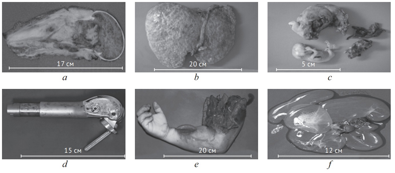 Рис. 1. Макропрепараты: a — сегментарная резекция правого бедра по поводу остеосаркомы. Центральная костная пластина, выпиленная в сагиттальной плоскости. На фотографии видна опухоль с массивным бесструктурным участком некроза и геморрагической инфильтрации. Опухоль захватывает диафиз, метафиз, интрамедуллярное пространство, кортикальную часть кости и частично мягкие ткани. Маркированные края резекции без видимого опухолевого роста; b — макропрепарат удаленного нативного органа с выраженным циррозом при операции по трансплантации печени; c — фрагментированные части маточной трубы и плод при прервавшейся эктопической беременности; d — дистальный феморальный протез, извлеченный вследствие износа. Препарат доставлен для макроскопического исследования и фотодокументации; е — макропрепарат травматической ампутации правой верхней конечности на уровне средней трети плеча при автомобильной травме. Края кожи на уровне ампутации неровные, мягкие ткани размозжены, отмечается геморрагическая инфильтрация. Визуализируется оскольчатый перелом плечевой кости. На внутренней поверхности предплечья послеоперационная рана; f — препарат мезотелиальной кисты брюшной полости