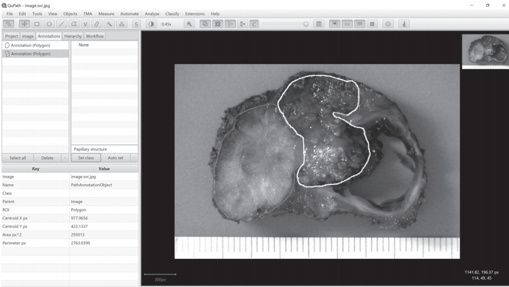 Рис. 2. Пример работы с программным обеспечением QuPath для аннотации цифрового изображения макропрепарата опухоли щитовидной железы