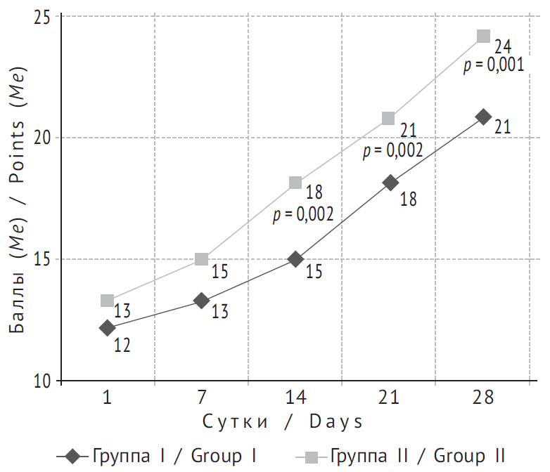 С 14-х суток жизни у новорожденных I группы отмечается статистически значимое отставание в нейромышечном и физическом развитии по шкале J. Ballard (р = 0,002), эта тенденция сохраняется до конца неонатального периода (р = 0,001) (рис. 1).
