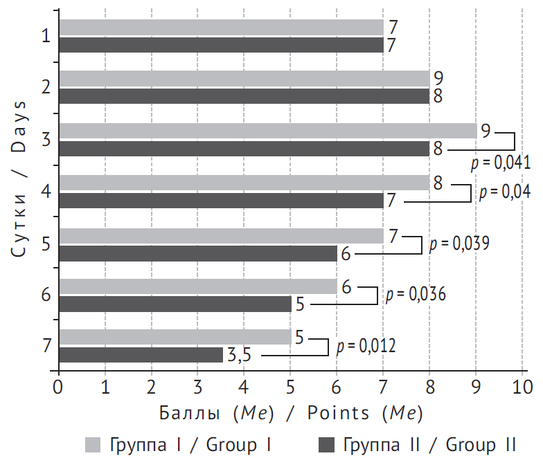 В первые двое суток уровень боли у пациентов обеих групп также был статистически неразличим (р > 0,05). Максимальная интенсивность боли у детей I группы была отмечена на третьи сутки жизни, оценка по шкале EDIN6 составила 9 баллов. Начиная с третьих суток жизни и до конца раннего неонатального периода, интенсивность боли была статистически значимо выше у детей I группы (р < 0,05).