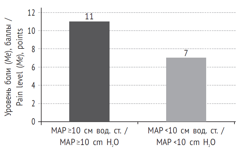 При анализе респираторной поддержки выявлено, что у тех детей, которым при проведении ИВЛ (I группа) требовалось среднее давление в дыхательных путях (МАР) ≥ 10 см Н2О [n = 6 (17,6 %)], уровень боли составил 11 [10; 11] баллов, что соответствует критериям сильной боли по шкале EDIN6 и статистически значимо больше (р = 0,001), чем у детей на ИВЛ с МАР <10 см Н2О (рис. 3).