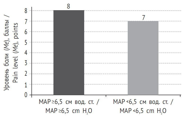 Установлено, что у детей, которым для проведения СРАР-терапии был необходим уровень МАР ≥ 6,5 см Н2О [n = 9 (15,5 %)], уровень боли фиксировался как самый большой в группе — 8 [7; 9] баллов и соответствовал критериям умеренной боли (рис. 4).