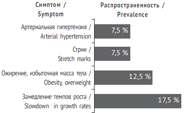 Рис. 1. Основные клинические проявления передозировки глюкокортикостероидов у 33 пациентов с сольтеряющей формой дисфункции коры надпочечников, госпитализированных в плановом порядке