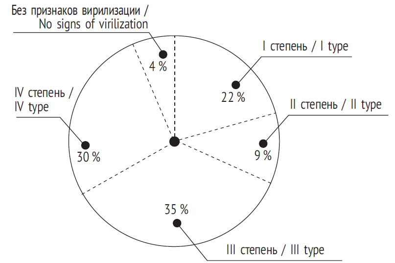 Рис. 3. Вирилизация наружных гениталий у 23 девочек, участвовавших в данном исследовании (процентное соотношение различных степеней вирилизации)