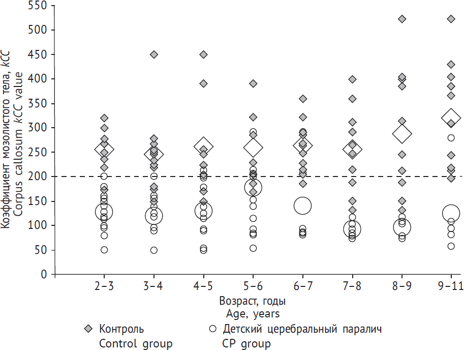 Согласно результатам наших исследований, у детей в возрасте от 2 до 11 лет площадь комиссуры на срединных сагиттальных срезах достоверно ниже у больных ДЦП в сравнении с их ровесниками без неврологических патологий. Значения коэффициента мозолистого тела при ДЦП достоверно меньше, чем в группе контроля, независимо от возраста. При этом у 85 % исследованных детей с ДЦП значения kСС ниже порогового значения, а у 78 % детей группы контроля — выше.