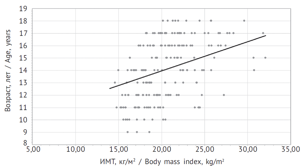 Рисунок. Корреляционная связь между возрастом и индексом массы тела