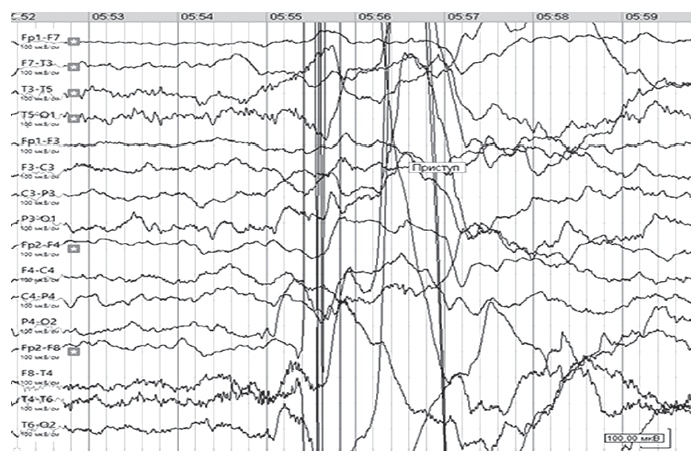 Были отмечены startle-реакции на неожиданный стимул (звук, вспышка света при проведении фотостимуляции, прикосновение). Генерализованная двигательная реакция (резкое вздрагивание) сопровождалась периодически бронхоспазмом. При динамическом наблюдении у ребенка отмечались пароксизмальные состояния в виде апноэ, миоклоний и эпизодов, напоминающих фокальные моторные приступы, приступы бронхоспазма. Проводилось мониторирование видеоэлектроэнцефалограммы в динамике, результаты которого не подтвердили эпилептический генез указанных пароксизмов (рис. 1).