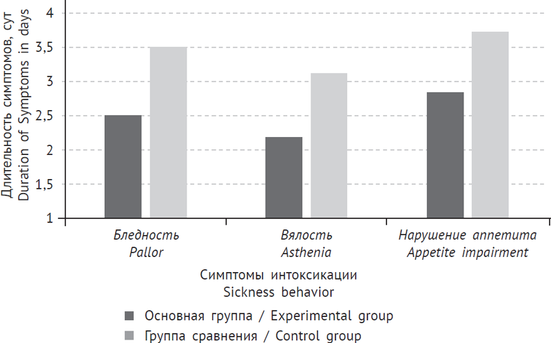 Длительность лихорадки у детей, получавших препарат Виферон®, оказалась на 1,3 сут меньше, чем в группе сравнения (рис. 3). Продолжительность симптомов интоксикации (бледность, вялость, нарушение аппетита) в сравниваемых группах представлены на рис. 4. В динамике диарейного синдрома также выявлены достоверные различия.