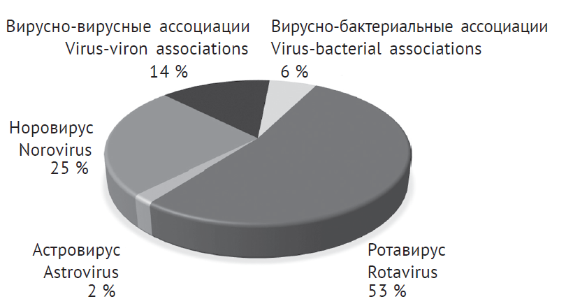 Ведущее место в структуре вирусных поражений ЖКТ занимает ротавирусная инфекция (РВИ), удельный вес которой среди всех ОКИ установленной этиологии составляет 30–35 %, а в период эпидемического подъема заболеваемости достигает 50–70 % [12]. В то же время с середины 1990-х гг. наблюдается возрастание роли норовирусной инфекции (НВИ), для которой характерны вспышки в организованных детских коллективах. По данным системы эпиднадзора различных стран, до 90 % эпидемических вспышек небактериальных гастроэнтеритов вызваны норовирусами. При этом в развитых странах они являются наиболее распространенным возбудителем острых гастроэнтеритов у взрослых и у 12,5 % детей младше 5 лет [13]. По литературным данным, аденовирусы серогруппы F являются третьим по значимости этиологическим агентом вирусных поражений ЖКТ [6, 15, 18]. При изучении распространенности астровирусной инфекции у детей установлено, что в 92 % случаев вируснейтрализующие антитела выявлялись к серотипу 1, в 69 % случаев — к серотипу 3, в 50 % случаев — к серотипу 4, в 36 % случаев — к серотипу 5, у 31 % обследованных детей — к серотипу 2 [16].