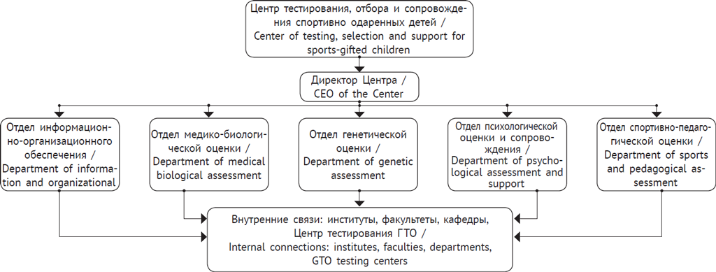 Для решения этой задачи в 2017 г. на базе Национального государственного университета физической культуры, спорта и здоровья им. П.Ф. Лесгафта был создан Центр тестирования, отбора и сопровождения спортивно одаренных детей и подростков (Центр). Создание Центра сопровождалось агитационно-просветительской работой среди родителей и детей о требованиях, которые предъявляют отдельные виды спорта к индивидуальным способностям человека, о структуре и составе спортивных способностей в конкретных спортивных дисциплинах, о влиянии занятий спортом на состояние здоровья и психофизическое развитие детей и подростков. Целью и задачами Центра являются комплексная диагностика спортивных задатков и способностей детей и подростков, оказание помощи в выборе предмета спортивной специализации, а также выявление наиболее одаренных и перспективных детей для углубленного совершенствования в избранном виде спорта, медико-биологическое сопровождение их многолетней спортивной подготовки. Организационная структура Центра представлена на рис. 1.