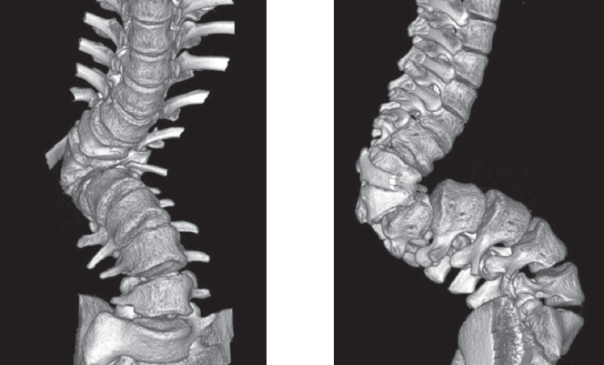 Больная Н., 12 лет, поступила в СПбГПМУ с жалобами на тяжелую кифосколиотическую деформацию грудопоясничного перехода. Деформация была замечена в возрасте 5 месяцев, однако оперативное лечение ребенку выполнено не было. На рентгенограммах сколиотический компонент деформации составляет 53°, кифотический — 86°.