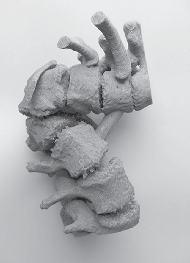 Порок развития идентифицирован как заднебоковой полупозвонок L1. При обследовании выявлена сопутствующая патология — леворасположенная L-образная почка. Учитывая высокий потенциал дальнейшей прогрессии кифоза и сохраняющийся риск неврологического ухудшения, ребенку показано оперативное лечение. Для планирования операции на основе данных компьютерной томографии с помощью 3D-печати изготовлена модель зоны порока (рис. 4).