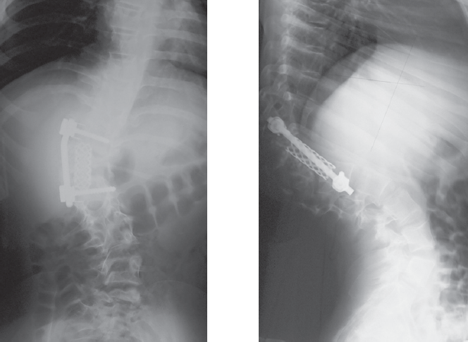 Наложено краниофеморальное скелетное вытяжение. За 35 суток достигнута коррекция сколиотической деформации на 17° (32 %), кифотической — на 12° (14 %). Учитывая расположение правого мочеточника в зоне доступа к телам позвонков грудопоясничного перехода, непосредственно перед основным этапом оперативного лечения под контролем флюороскопии в мочеточник заведен стент. В положении на левом боку выполнена торакофренолюмботомия через ложе 12-го ребра. Отмечено снижение высоты межпозвонковых дисков, отсутствие пульпозных ядер на вершине деформации, конкресценция тел Th12 и полупозвонка L1. Дискэпифизэктомия в парах Th11-Th12, L1-L2, L2-L3, спондилодез сульфатом кальция в комбинации с аутогенной костью (резецированное ребро). Между телами позвонков Th11 и L3 установлен сетчатый имплант Mash. Через тела позвонков Th11 и L3 бикортикально проведены винты, коммутированы стержнем. Плевральная полость и забрюшинное пространство дренированы. Рана послойно ушита. На 12-е сутки после операции больная вертикализирована в корсете. Через 5 месяцев госпитализирована для контрольного обследования и проведения заключительного этапа хирургического лечения. По данным рентгенографии, достигнутая коррекция сохраняется (рис. 5). В качестве заключительной операции выполнен задний спондилодез на вершине деформации.