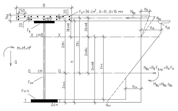 Рис. 1. Расчётная схема и эпюра предельных напряжений бисталежелезобетонного сечения