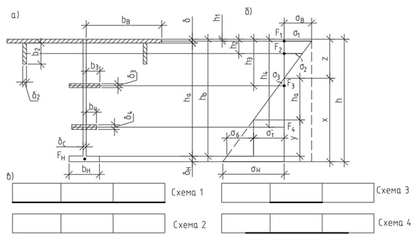 Рис. 2. Расчётная схема, эпюра предельных напряжений и схемы пролётных строений: а – расчетная схема; б – эпюра пред. напряжений; в – схемы пролётных строений