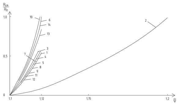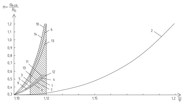 Рис. 4. График зависимости строительного коэффициента от отношения пределов прочности стали стенки к стали пояса для пролетных строений: