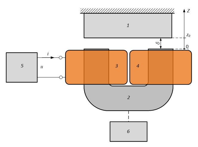 В данной работе в качестве примера рассматривается одноточечная модель электромагнитного подвеса (Рис. 1), состоящая из пассивного ферромагнитного элемента 1, закрепленного на неподвижной конструкции, и силового электромагнитного элемента с U-образным магнитопроводом 2 и обмотками 3, 4, расположенными на его полюсах. Силовой электромагнитный элемент механически соединен с грузом 6. Обмотки 3, 4 получают питание от регулируемого источника напряжения 5. Предполагается, что силовой электромагнитный элемент может перемещаться вдоль оси Z. Начало отсчета 0, совпадает с гранью полюса магнитопровода 2. Текущее значение воздушного зазора δ(t) определяется из следующего выражения:
