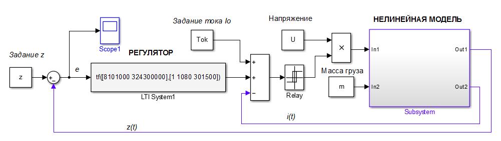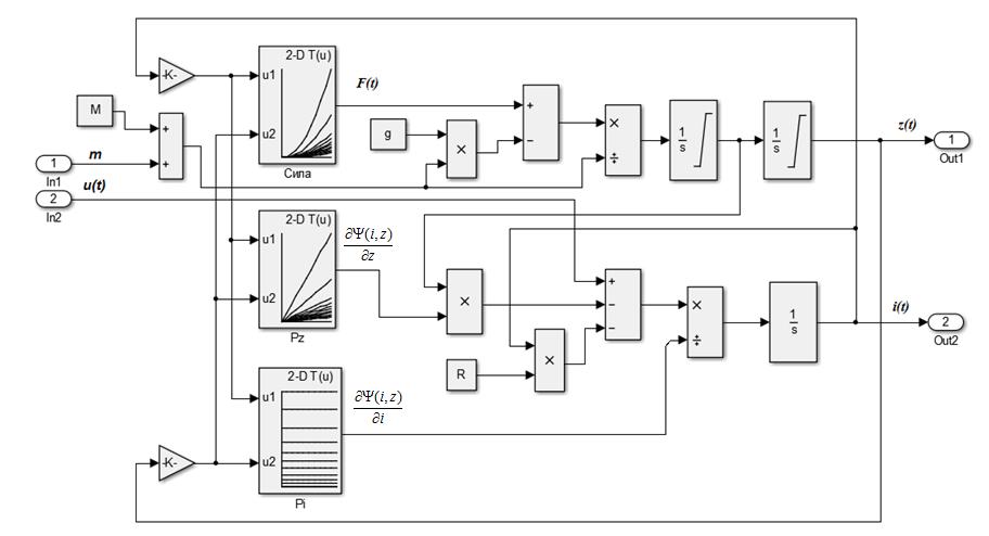 На Рис. 2 приведена Simulink-модель объекта управления. На входе In1 задается значение массы груза m, а на входе In2 сигнал напряжения u(t). На выходах Out1 и Out2 формируются сигналы перемещения z(t) и тока i(t). В модели зависимости Fz(i(t),z(t)), ∂Ψ(i(t),z(t))/∂i, ∂Ψ(i(t),z(t))/∂z, присутствующие в формуле (2), представлены в табличной форме.