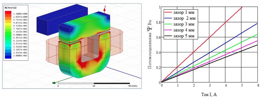 На рисунке 3b приведено семейство зависимостей потокосцепления обмотки от тока и зазора Ψ(i,δ), рассчитанное на твердотельной модели для двух катушечной обмотки, имеющей 539 числом витков, и сопротивлением R = 3,622 Ом при 20°С.