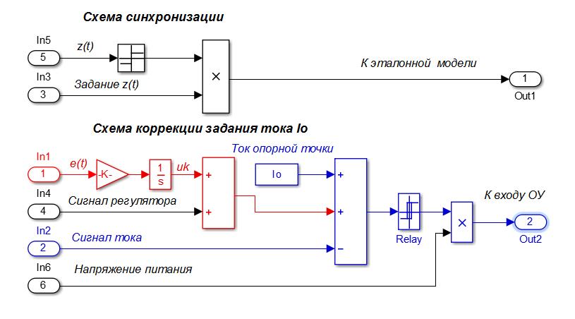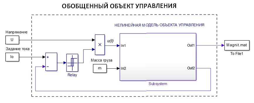 Для задания и стабилизации начального значения тока I0 нелинейная модель объекта управления охвачена отрицательной обратной связью по току. Стабилизация тока осуществляется релейным регулятором, формирующим импульсный сигнал на входе In1 подсистемы модели объекта управления. Амплитуда импульсов определяется напряжением U источника питания. Введение дополнительного контура обратной связи в модель объекта управления позволяет ввести в рассмотрение обобщенный объект управления с двумя входами по току I0 и напряжению U источника питания.
