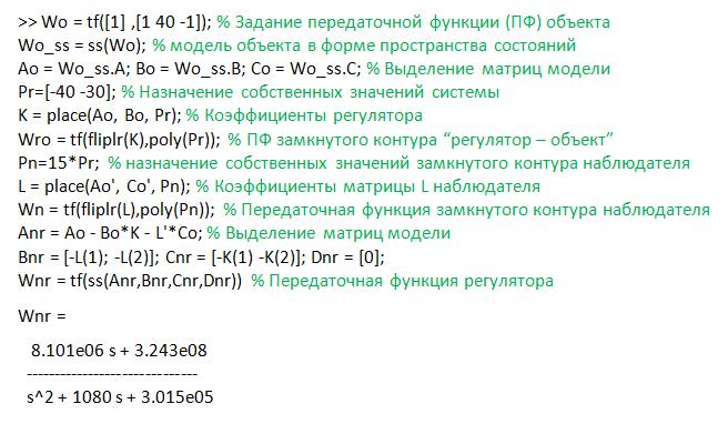 На Рис. 6 представлен фрагмент программы синтеза регулятора с наблюдателем состояния.