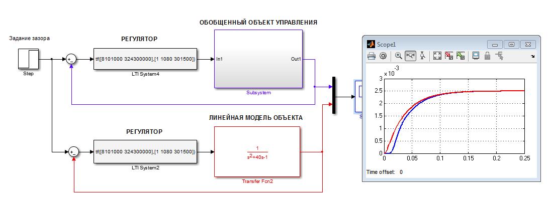 В результате расчета получена передаточная функция Wnr регулятора. Далее синтезированный линейный регулятор проверяется на модели обобщенного объекта управления. Для этого регулятор включается в замкнутый контур стабилизации зазора с обобщенным объектом управления, как показано на Рис. 7. Для сравнения процессов на Рис. 7 так же показан замкнутый контур стабилизации зазора с линейной моделью объекта управления.