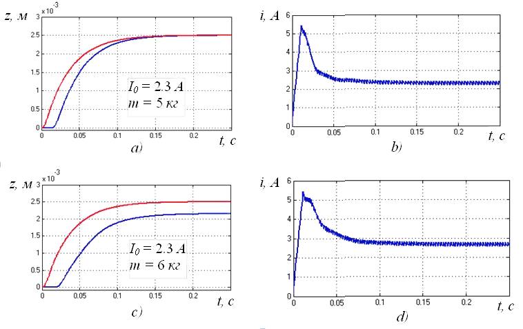 Исследование системы управления в условиях изменяющейся массы груза показало, что заданное качество регулирования обеспечивается в окрестностях рабочей точки, задаваемой током I0. Изменение массы (при I0 = const.) переводит систему в новое состояние равновесия при новых значениях зазора и тока. Система при этом сохраняет устойчивость, а характер переходного процесса практически остается неизменным. Это демонстрируют осциллограммы, приведенные на Рис. 8.