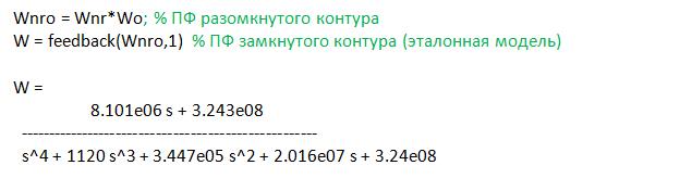 В рассматриваемом примере в качестве эталонного процесса удобно принять процесс, формируемый замкнутой системой управления в номинальном режиме работы системы. В этом случае эталонной моделью может служить передаточная функция замкнутого контура системы.