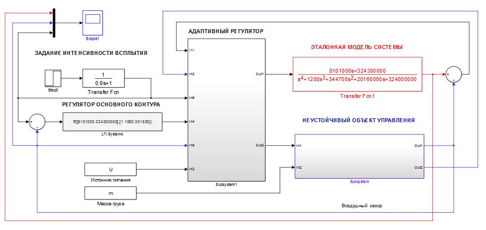На Рис. 12 приведена модель системы управления магнитным подвесом с адаптивным регулятором.