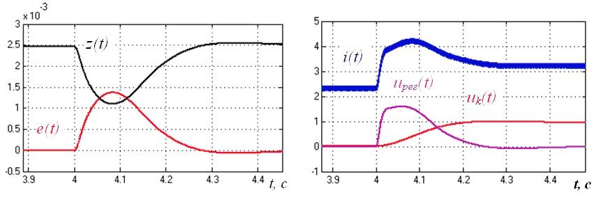 Из осциллограмм следует, что в момент времени t = 4 с величина вертикального перемещения магнита z(t) отклоняется от заданного значения. В результате чего появляется ошибка рассогласования e(t) между моделью и объектом (Рис. 14а). Это приводит к генерации сигнала управляющего воздействия uрег в основном контуре регулирования и сигнала uk коррекции тока опорной точки (Рис. 14b). Под действием сигналов управления ошибка по зазору компенсируется за счет увеличения тока i(t). При этом система переводится в новое состояние равновесия за время t = 0,3 с с момента изменения массы груза.