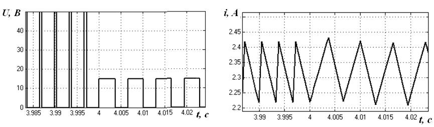 Моделирование процессов в системе при ступенчатом изменении напряжения источника питания выявило отсутствие реакции на данный тип возмущения. Это объясняется тем, что для задания и стабилизации опорного значения тока нелинейная модель объекта управления охвачена отрицательной обратной связью по току (как показано на рисунке 4). Стабилизация тока осуществляется релейным регулятором, формирующим импульсный сигнал. Амплитуда импульсов определяется напряжением U источника питания. Это делает систему не чувствительной к изменению напряжения питания. Например, на Рис. 16 показаны осциллограммы, демонстрирующие данное утверждение.