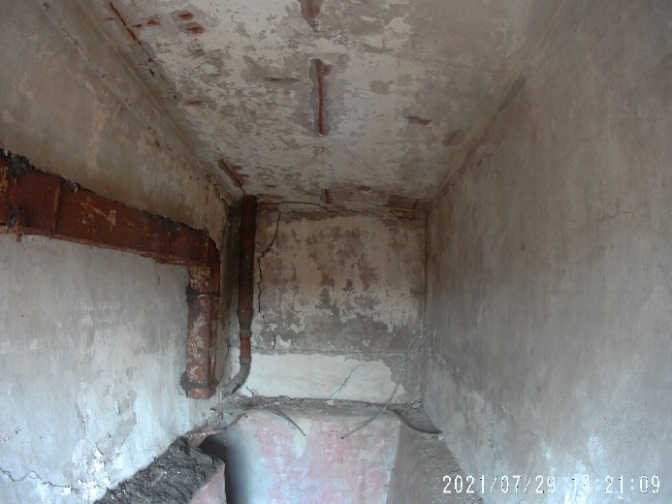 Другими, менее значимыми повреждениями убежищ являются: трещины в полах и стыках сборных элементов стен и перекрытий, вызванные переувлажнением помещения и протечками из-за ненадлежащего устройства гидроизоляции, ветхость отделки, неисправность и неукомплектованность инженерного оборудования (Рис. 4).