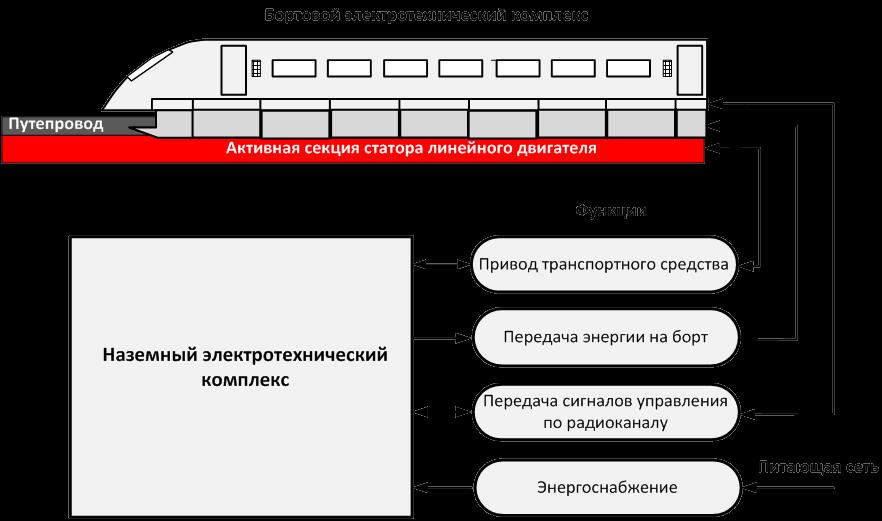 Электротехнический комплекс МЛТС включает в себя пять функциональных компонентов: систему энергоснабжения; систему электромагнитного подвеса; систему линейного электропривода; систему боковой стабилизации; систему управления.
