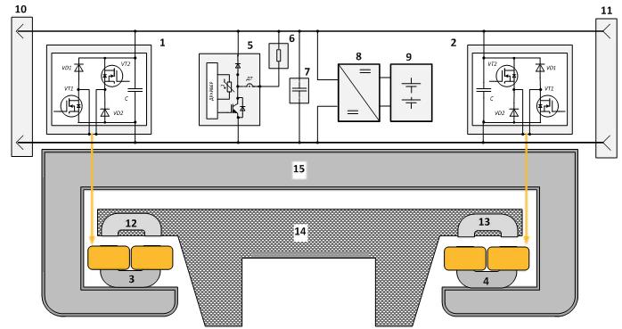 Функциональная схема электротехнического комплекса приведена на Рис. 3. Энергоснабжение силовых компонентов электротехнического комплекса при их расположении на транспортной платформе 15 осуществляется от автономной энергетической установки, которая может располагаться на одной из грузовых платформ подвижного состава, через силовые разъемы 10, 11.