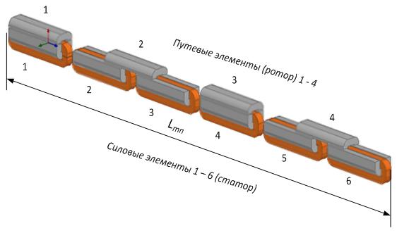 Предполагается, путевые элементы (ротор) 1–4 расположены на путевой структуре, а силовые элементы статора 1–6 установлены по бортам транспортной платформы и распределены по всей ее длине Lтп.