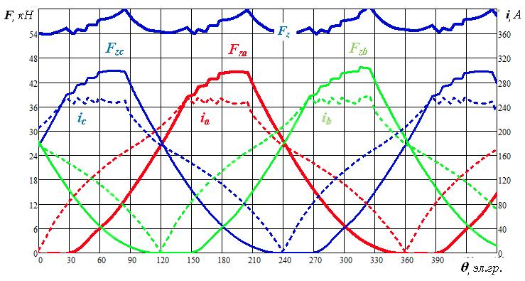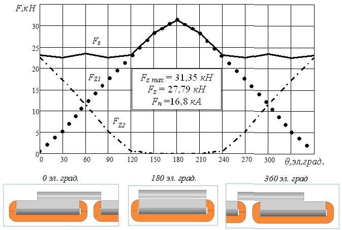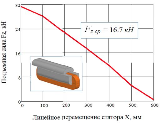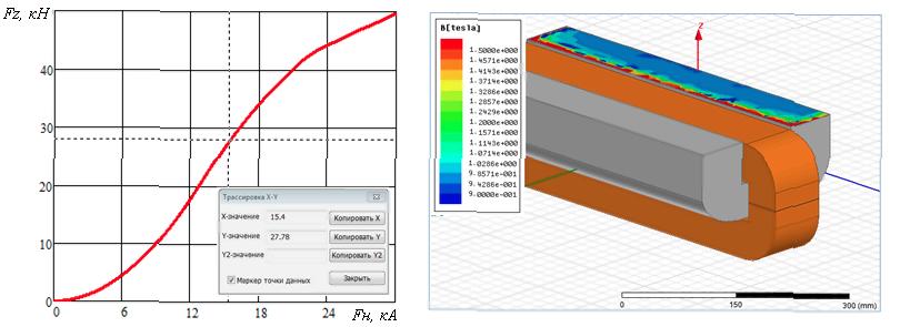 Из приведенных данных следует, что расчетная статическая нагрузка на путевой элемент от платформы Fz ≈ 27,8 кH, достигается при намагничивающей силе обмотки элемента статора Fн ≈ 15,4 кА. Среднее значение индукции в сечении зазора составляет Bδ = 0,985 Тл. Это практически совпадает с результатами инженерного расчета.