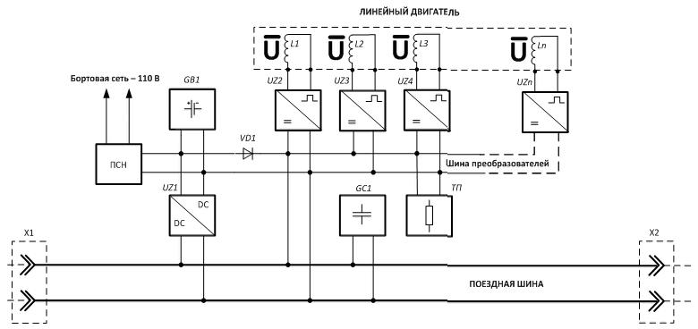 Структура системы энергоснабжения позволяет функционировать транспортной платформе как в составе поезда по системе многих единиц, так и автономно. В первом случае электропитание подается на поездную шину от газотурбинной энергетической установки. Во втором случае электропитание подается от аккумуляторной батареи GB1, расположенной на платформе. В любом случае обмотки статора L1 – Ln линейного двигателя получают питание от преобразователей энергии UZ2 – UZn в двигательном режиме работы или генерируют электродвижущую силу, которая преобразуется преобразователями UZ2 – UZn в постоянное напряжение на шине преобразователей в генераторном режиме работы линейного двигателя. Энергия, генерируемая линейным двигателем, поступает на емкостный накопитель энергии GC1 и накапливается в нем. Избыток генерируемой энергии рассеивается в тормозном преобразователе ТП. К поездной шине подключен зарядный преобразователь для заряда аккумуляторной батареи GB1 и питания преобразователя собственных нужд ПСН.