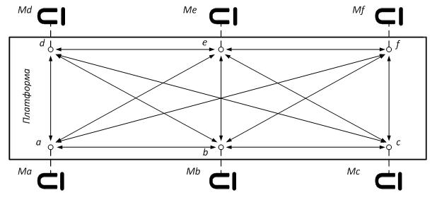 На рисунке 19 схематически показана транспортная платформа, по бортам которой установлены статоры линейных двигателей Ma – Mf. Между точками a, b, c, d, e, f приложения сил, создаваемых статорами линейного двигателя, возникают продольные поперечные и диагональные связи.