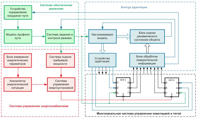 В блок обработки измерительной информации поступает вся доступная измерению информация о состоянии многоканальной системы управления левитацией и тягой. После предварительной обработки первичной информации данные передаются в блок оценки динамического состояния объекта, который идентифицирует динамическое состояние объекта и подстраивает параметры настраиваемой модели под параметры объекта управления. По результатам подстройки устройство адаптации формирует алгоритм коррекции задания для АСУ.