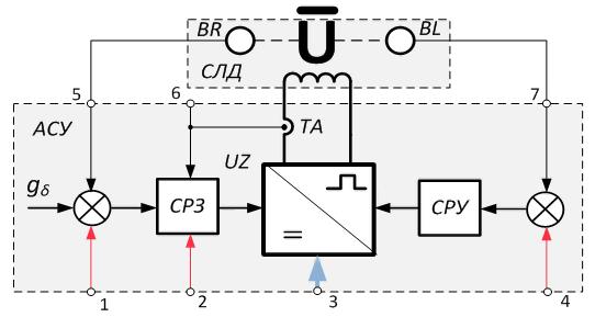 На схеме также показан статор линейного двигателя СЛД, который механически сочленен с датчиками воздушного зазора BR и положения BL.