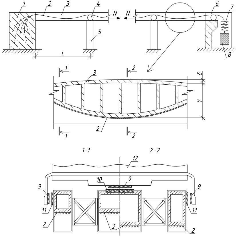 В этом случае небольшие по площади поперечного сечения струны обеспечат необходимую грузоподъемность и жесткость конструкции пролетного строения.