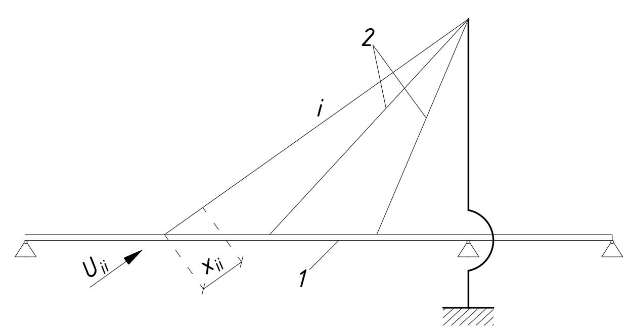 Рис. Схема балочно-вантовой системы: 1 – балка; 2 – ванты