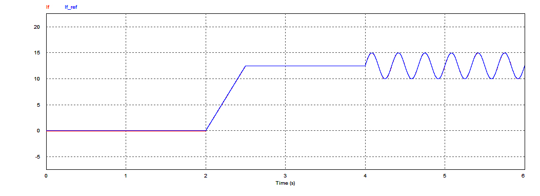 In the simulation analysis of the excitation source, voltage closed loop control is used in the boost circuit unit, and current closed loop feedback control is used in the single phase full bridge inverter unit. When the reference of excitation current is 12.5 A, the output current waveform of the excitation source is shown in Fig. 5. When the reference of excitation current is 12.5 A, besides, the sinusoidal fluctuation with amplitude 2.5 A and 3 Hz frequency is added. The output excitation current waveform of the excitation source is shown in Fig. 6.
