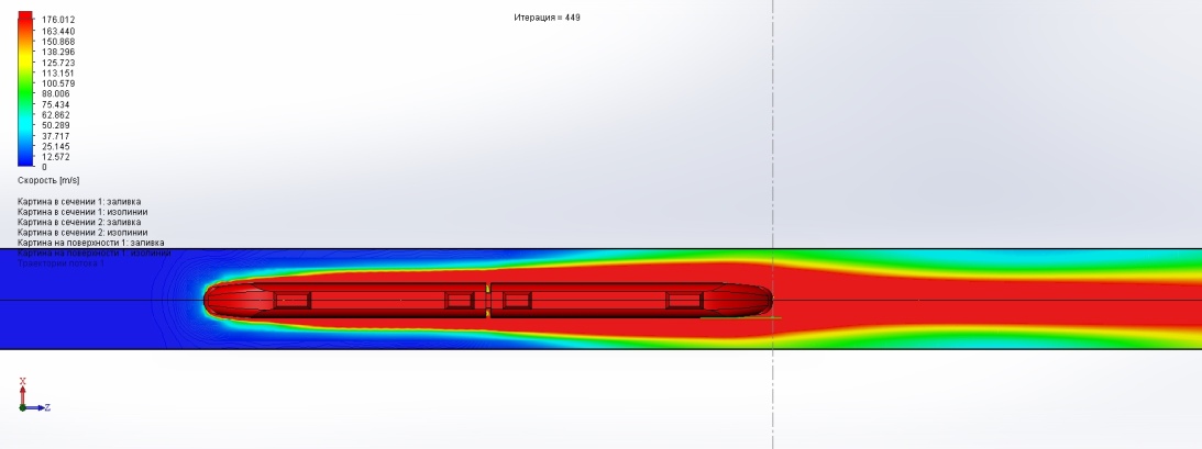 Fig. 1. The pattern of flow around a two-piece capsule with the dimensions of the “Sapsan” at a speed of 600 km/h