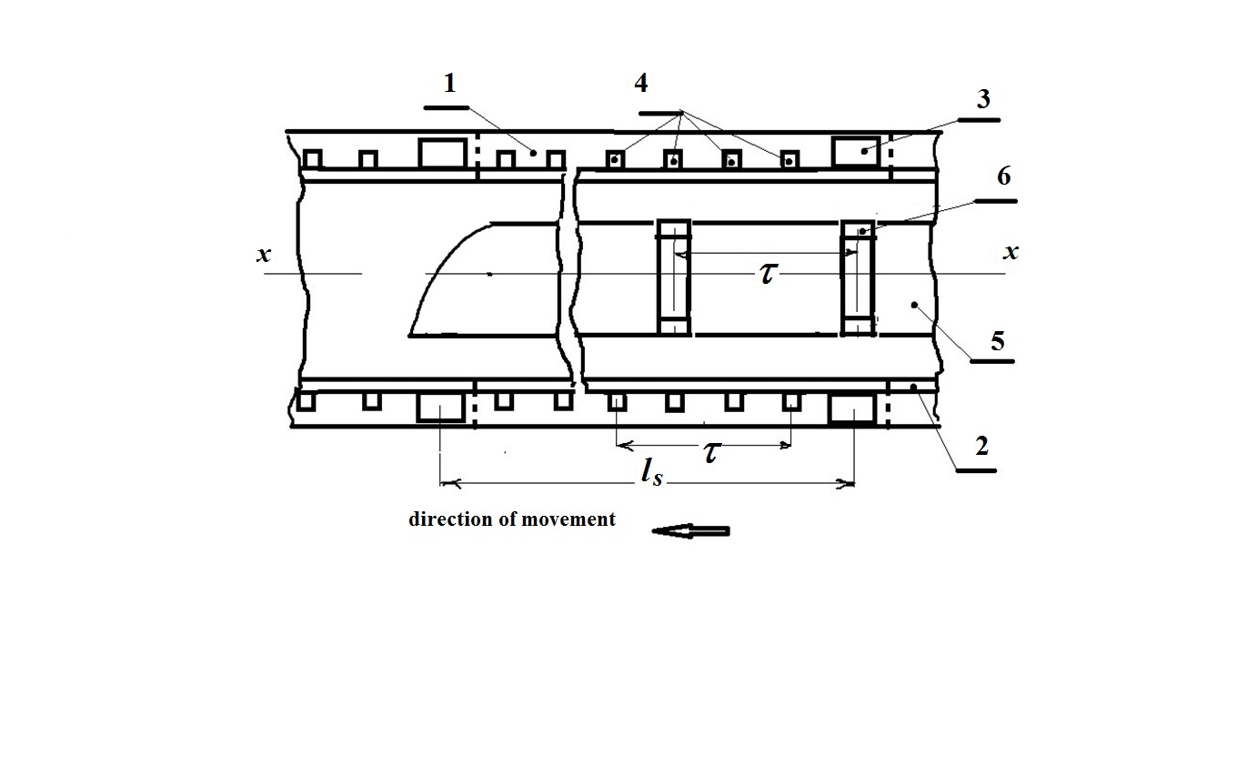 One of the variants of the transport system with a stator located on the pipe is shown in Fig. 3. Stator 2 of the linear motor is rigidly fixed on the inner surface of pipe 1 made of ferromagnetic material. The stator has concentrated inductor winding 3 and distributed three-phase winding 4. There is a system of short-circuited turns 6 on capsule 5. Stator 2 of the linear motor consists of electrically unconnected separate sections (segments). The beginning and end of the segment are shown by the dashed lines. All the segments are made similarly: inductor winding 3 is in the beginning segment, then three-phase winding 4 starts. The pole pitch (τ) of three-phase winding 4 is equal to the distance (τ) between adjacent short-circuited turns 6.