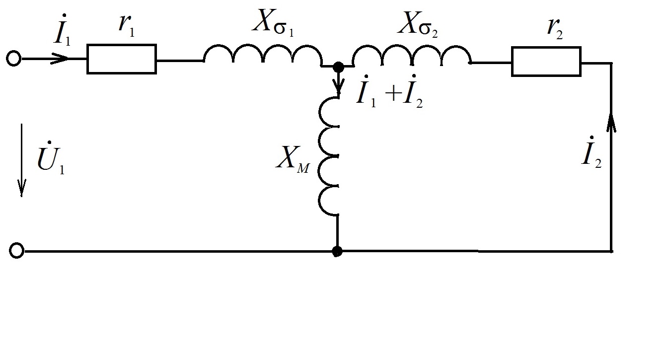 If we assume that the secondary magnitudes are reduced to the primary circuit in the equations (14) then the T-shaped equivalent circuit (Fig. 5) corresponds to them. In the scheme хM1 is the main inductive reactance of the primary circuit; xs1 is the inductive leakage resistance of the primary circuit (xs1 =x11 – xr1); xs2 is the leakage inductive resistance of the secondary circuit (xs2 = x22 – x r1); r1 and r2 are the resistances of the circuits. All these parameters can be calculated by the usual methods for the theory of electrical machines, except for xs2, and r2.