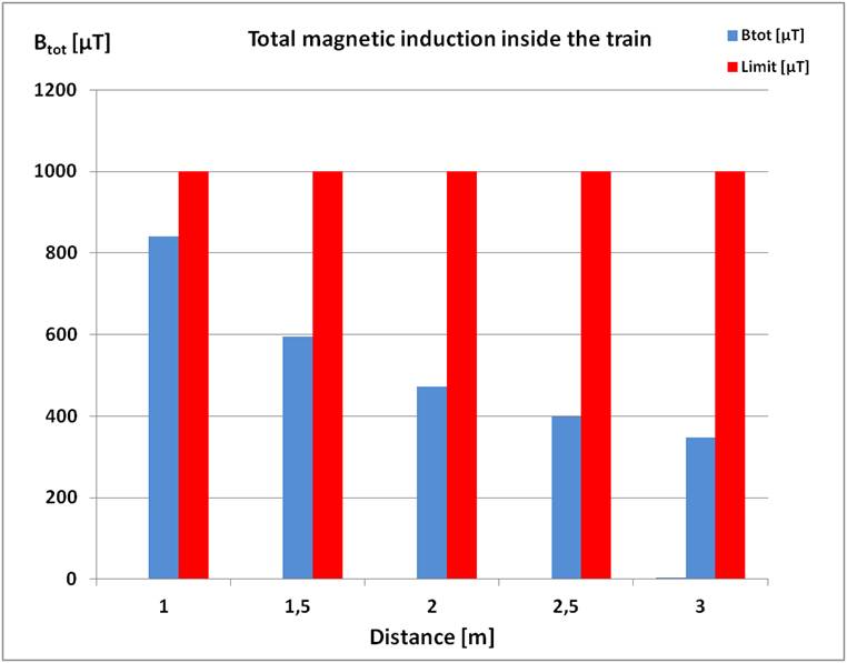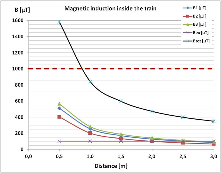 It is clearly seen that most of the contribution to the magnetic induction is caused by the large currents from the inverter to the motors (B3). However, the four motors are distributed over the driven train section. The external field from the 2 overhead power lines is of minor influence, only. By adding the maximum values of all 4 contributions at a distance of 1 m, the total induction Btot would peak around 800 µT. However, this is a theoretical and not a realistic value. Comparing with the frequency dependent limits of 300 µT (16.7 Hz), 500 µT (DC) and 200 µT (200 Hz) in Table 1, all field contributions remain well below the limits inside the train. In addition, the body of the wagon will further reduce the concentration of the magnetic field inside the train. The total magnetic induction inside the train depending on the distance from the location of the generated field is shown in Fig. 2.